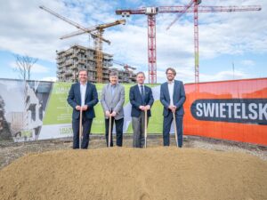 Spatenstich am Baufeld 4 im Village im Dritten: Swietelsky Hochbau-Niederlassungsleiter Christian Pichler, Bezirksvorsteher Erich Hohenberger, ARE Geschäftsführer Gerald Beck und ARE Projektentwicklungsleiter Gerd Pichler. © Stefan Seelig