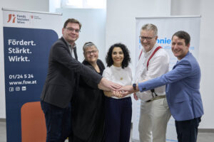 Eröffnung Chancenhaus Rossauer Lände: (v. l.) Wolfgang Ernst, Rektor der Diakonie, Alexandra Gröller, Geschäftsführerin der Diakonie Eine Welt Lebensräume, Bezirksvorsteherin Saya Ahmad, Sozialstadtrat Peter Hacker und Markus Hollendohner, Leiter der Wiener Wohnungslosenhilfe im FSW © Stadt Wien/Markus Wache