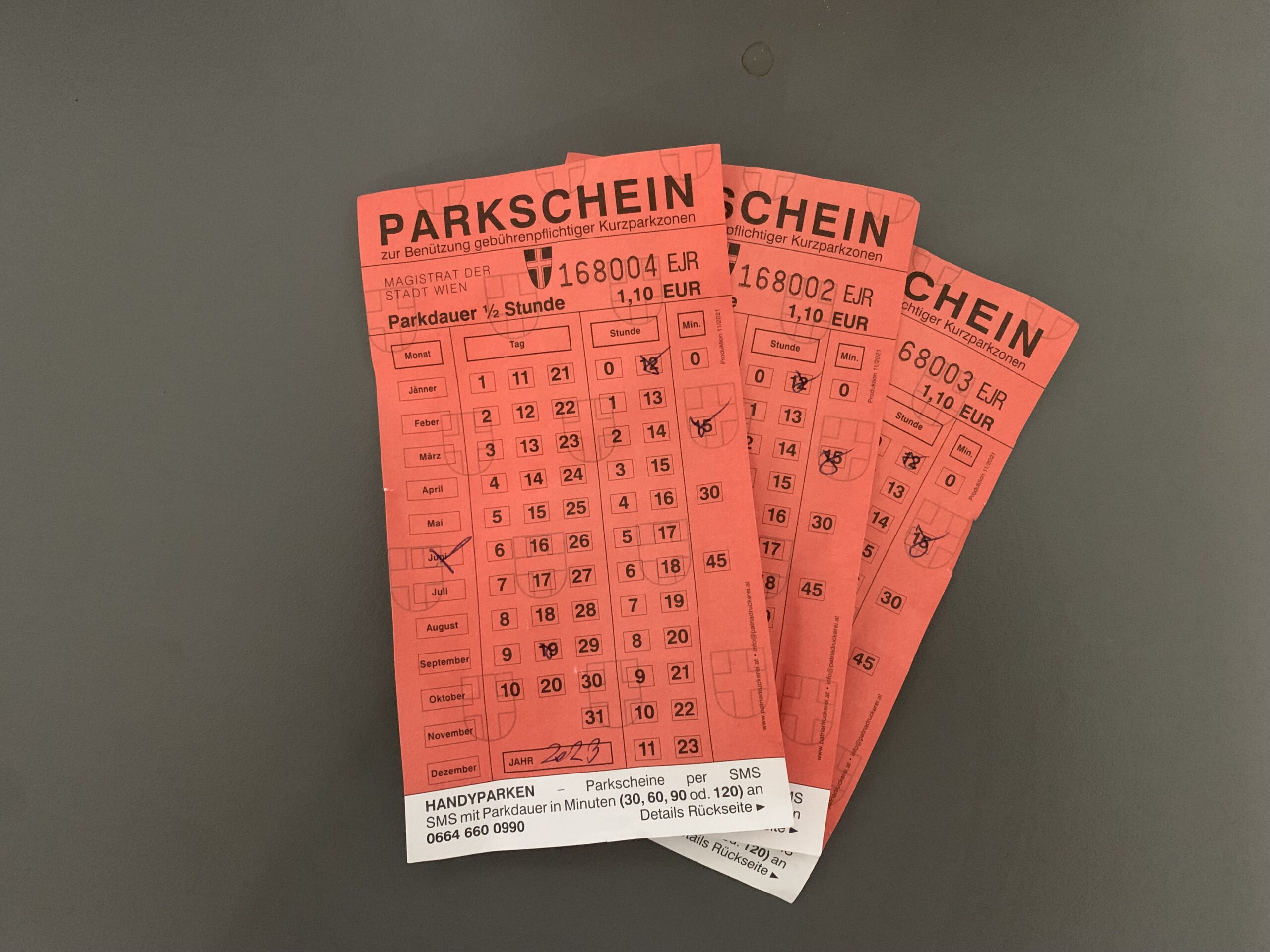 Ab. 1. Juli 2023 können nur mehr Parkscheine mit den unten angeführten Tarifen für das Parken in gebührenpflichtigen Kurzparkzonen verwendet werden: