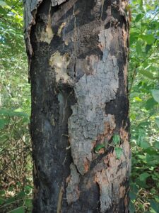 Erkennbar ist die Russrindenkrankheit durch die abblätternde Rinde, unter der der Stamm wie mit Ruß bedeckt schwarz ist. ©zvg: BV13