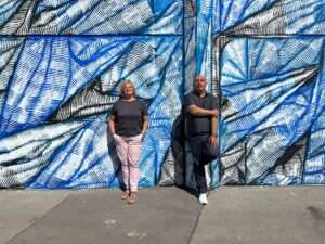 Bezirkschef Peter Jagsch und Stellvertreterin Mössmer-Cattalini haben sich vor der kreativ vom Künstler Manuel Skirl bemalten Trafoanlage am Schafberg verewigen lassen (Bild: BV Hernals).