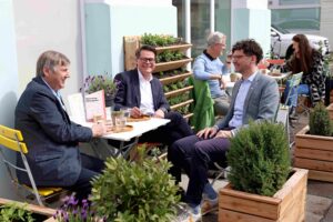 Stadtrat Jürgen Czernohorszky und Bezirksvorsteher Erich Hohenberger genossen gleich das angenehme Frühlingswetter iim naturnahen Gastgarten des „Schöneberg“. © Stadt Wien/Martin Votava