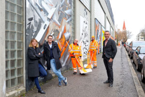 BV-Vize Stefanie Lamp, StR Jürgen Czernohorszky und Josef Thon, Abteiungleiter der MA48, besichtigen die neuen Graffitis am Mistplatz Ottakring (Bild: Votava).