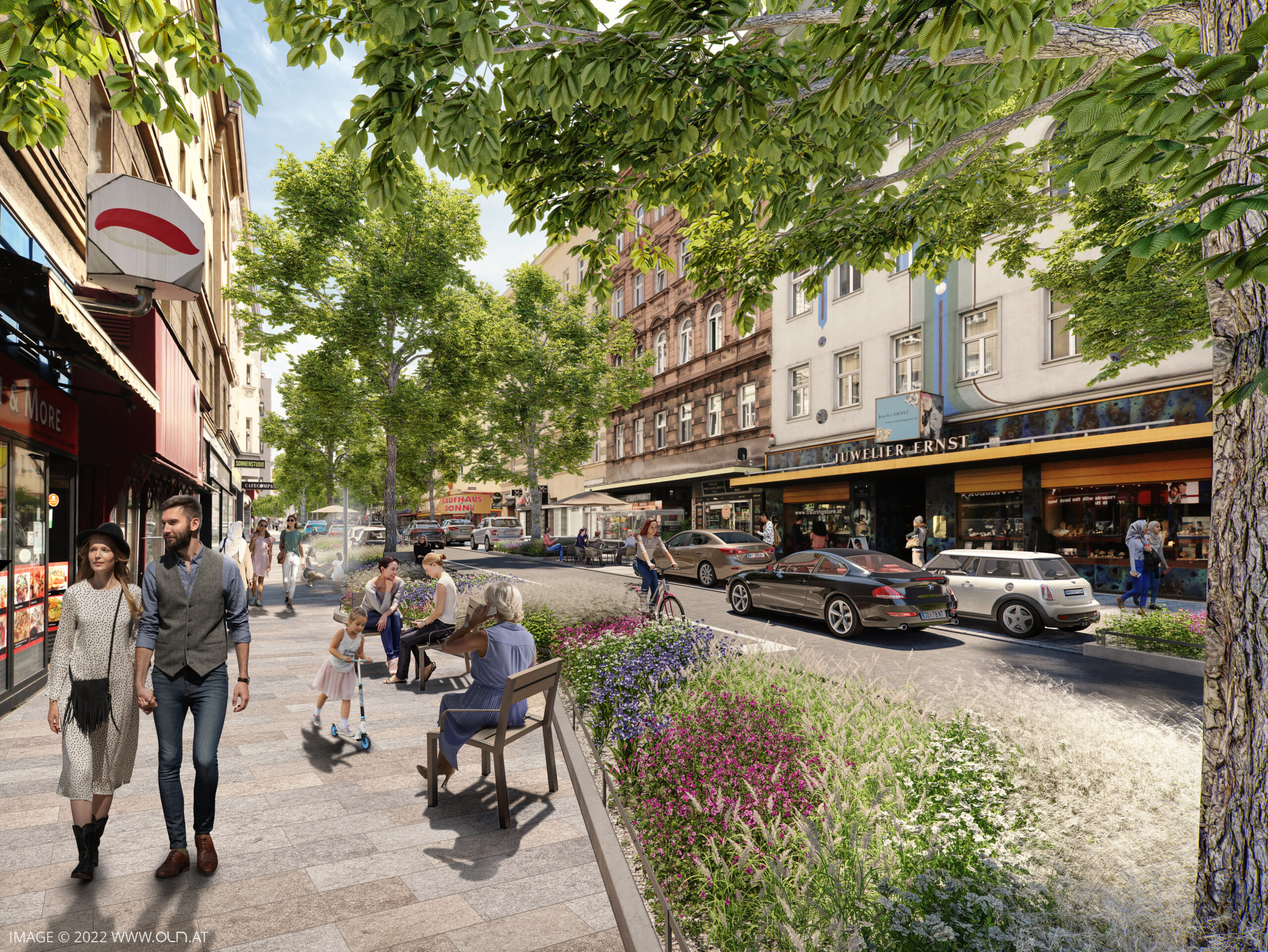 Nach Abschluss der Bauarbeiten wird die belebte Reinprechtsdorfer Straße nicht mehr wiederzuerkennen sein: 32 neue Bäume, zwei Wasserspiele, ausladende Grünbeete sowie eine Gehsteigvorziehung verwandeln sie in eine klimafitte Geschäftsstraße, die dauerhaft als Einbahn geführt werden wird. So bietet sie außerdem auch ausreichend Platz zum Flanieren und Verweilen. Die Umgestaltung des ersten Abschnitts zwischen Schönbrunner Straße und Arbeitergasse erfolgt bis November 2023. Die zweite Bauphase wird nach Fertigstellung der U-Bahnarbeiten bei den künftigen U5-Stationen Reinprechtsdorfer Straße und Matzleinsdorfer Platz durchgeführt.