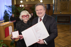 Dolores Schmidinger mit Bürgermeister Michael Ludwig im Rathaus Stadtsenatssitzungssaal bei der Verleihung der Ehrenmedaille der Bundeshauptstadt Wien in Gold. | ©Stadt Wien/Markus Wache