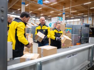 Michael Ludwig (r.) und Toni Faber (Mitte) beim "Packerl schupfen" © Österreichische Post AG