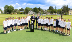 Nachwuchs der Sportunion Mauer mit Vereinsobmann Oliver Loibnegger, Unternehmer und Investor Klemens Hallmann und SÜBA-Vorstand Manfred Wachtler (v.l.n.r.) ©Hallmann Holding/SÜBA AG/C. Mikes