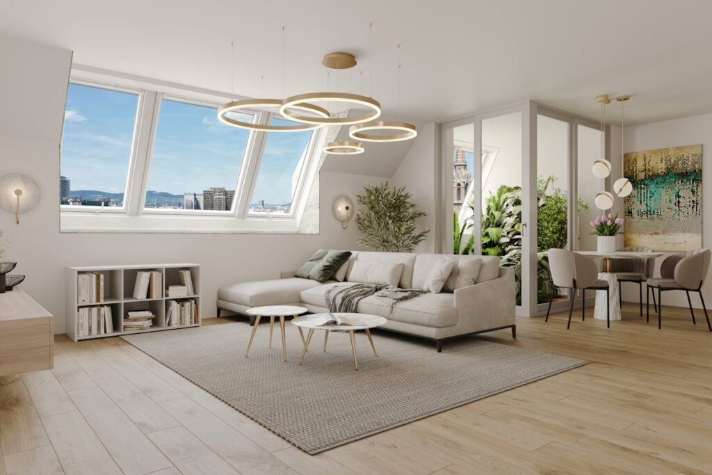 Die exklusive Ausstattung mit Eichenböden und teilweise Stuckdecken und der Blick auf Wien machen Das Seidl zu einem wahren Wohntraum. © Das Seidl