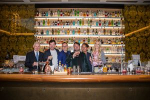 Startanzlehrer Thomas Schäfer-Elmayer, Opernsänger Daniel Serafin, Truth and Dare Barkeeper David Kanabitl und Dominik Möller, The Sign Lounge Barkeeper Kan Zou und Miss Europe Beatrice Körmer hinter der Bar im Steigenberger Herrenhof. | ©Sofia Gómez Kabelka