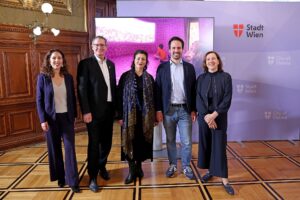 ZOOM-Direktorin Andrea Zsutty, BV Georg Papai, Kulturstadträtin Veronica Kaup-Hasler, Vizebürgermeister Christoph Wiederkehr und Karin Haller von Kidlit Medien. ©PID/Votava