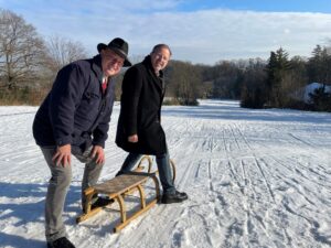 Bezirksvorsteher Nikolaus Ebert gemeinsam mit BV-Stellvertreter Christian Gerzabek beim Rodeln vor Ort. ©BV13