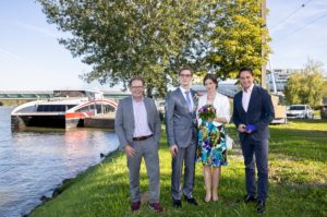 v.l.n.r.-Gerd-Kraemer-GF-Central-Danube-Braeutigam-Armin-Radlherr-Braut-Sophie-Wagner-Kurt-Gollowitzer-GF-Wien-Holding-c-Eva-Kelety