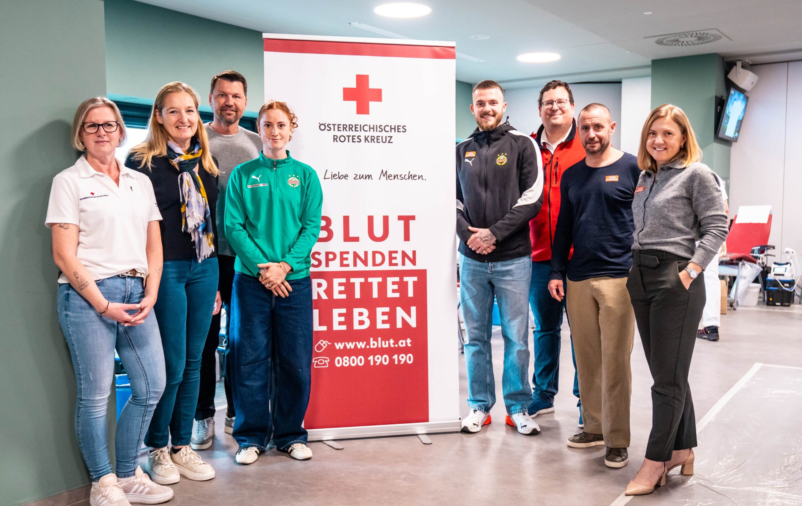 Brave Spender: Daniela Bauer (r.), Steffen Hofmann, Jannes Horn, Markus Katzer (l.) und Mitarbeiter des Roten Kreuzes (Bild: Daniel Widner/Rapid).