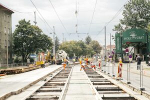 Gleisbauarbeiten mit Erneuerung des Gleisuntergrundes auf der Linie 49 im Bereich Baumgarten bis Hütteldorf.