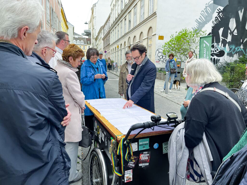 ©kirchberggasse.at | Bezirkschef Markus Reiter präsentierte die Pläne für die Umgestaltung der Kirchberggase vor Ort.