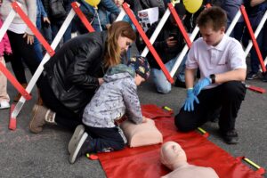 Bei der Erste-Hilfe-Mitmachstation lernen auch die Kinder, worauf es im Notfall ankommt. ©Johanniter