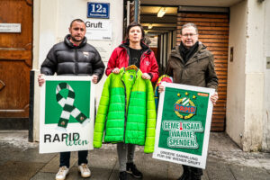 Übergabe: Rapid-GF Steffen Hofmann, Elisabeth Pichler (Leiterin der Gruft) und Rapid-Präsident Alexander Wrabetz (Bild: SK Rapid).