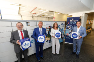 (C) PID/Fürthner: v.l.n.r.: Wiener Stadwerke Generaldirektor Martin Kracjsir, WKW-Präsident Walter Ruck, Mobilitätsstadträtin Ulli Sima, Wirtschaftsstadtrat Peter Hanke bei der Eröffnung der ersten WienBox