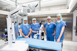 Die Primarii Martin Dominkus, Wolfgang Schneider, Gerald Loho und Christian Albrecht (v.l.) mit dem Velys-Orthopdieroboter. © Vinzenz Gruppe Wien / Kawka