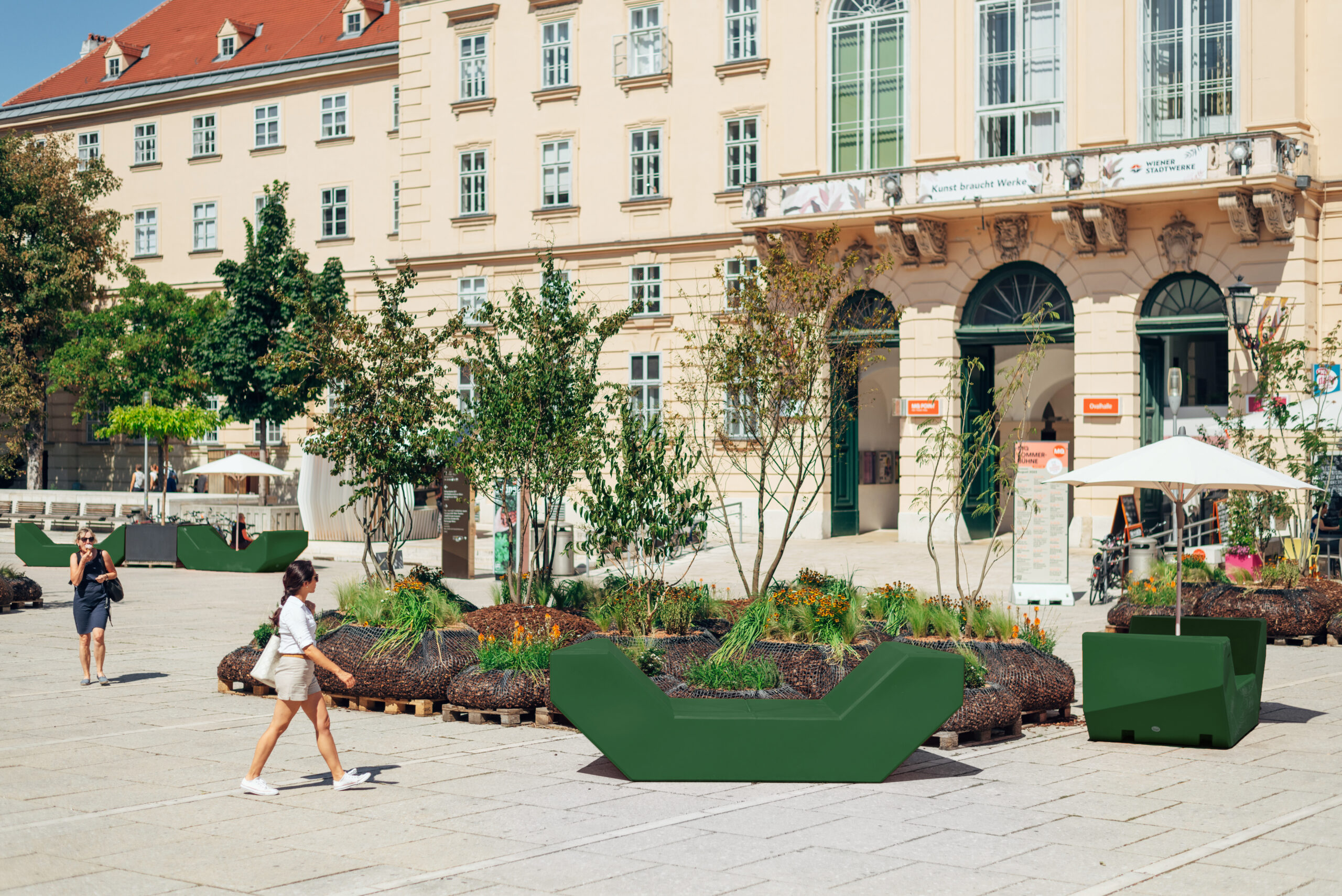 Nicht nur die neue Farbwahl der Enzis passt zur Strategie, die das MuseumsQuartier mit “MQ goes Green” verfolgt, sondern die neuen Sitzmöbel bestehen 2024 erstmals aus bis zu 70 Prozent Recyclat aus Getränkekartons. Die Enzi-Erfinder:innen Anna Popelka und Georg Poduschka vom Architekturbüro PPAG haben gemeinsam mit dem Produzenten seit längerem an einer geeigneten Recycling-Version der Möbelklassiker getüftelt. Auch diese Version der Hofmöbel ist nach Ablauf ihrer Lebensdauer wie bisher vollständig recyclebar und bleibt dem Stoffkreislauf erhalten.