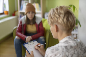 A female mental health therapist taking notes while a teenage girl talking about her problems