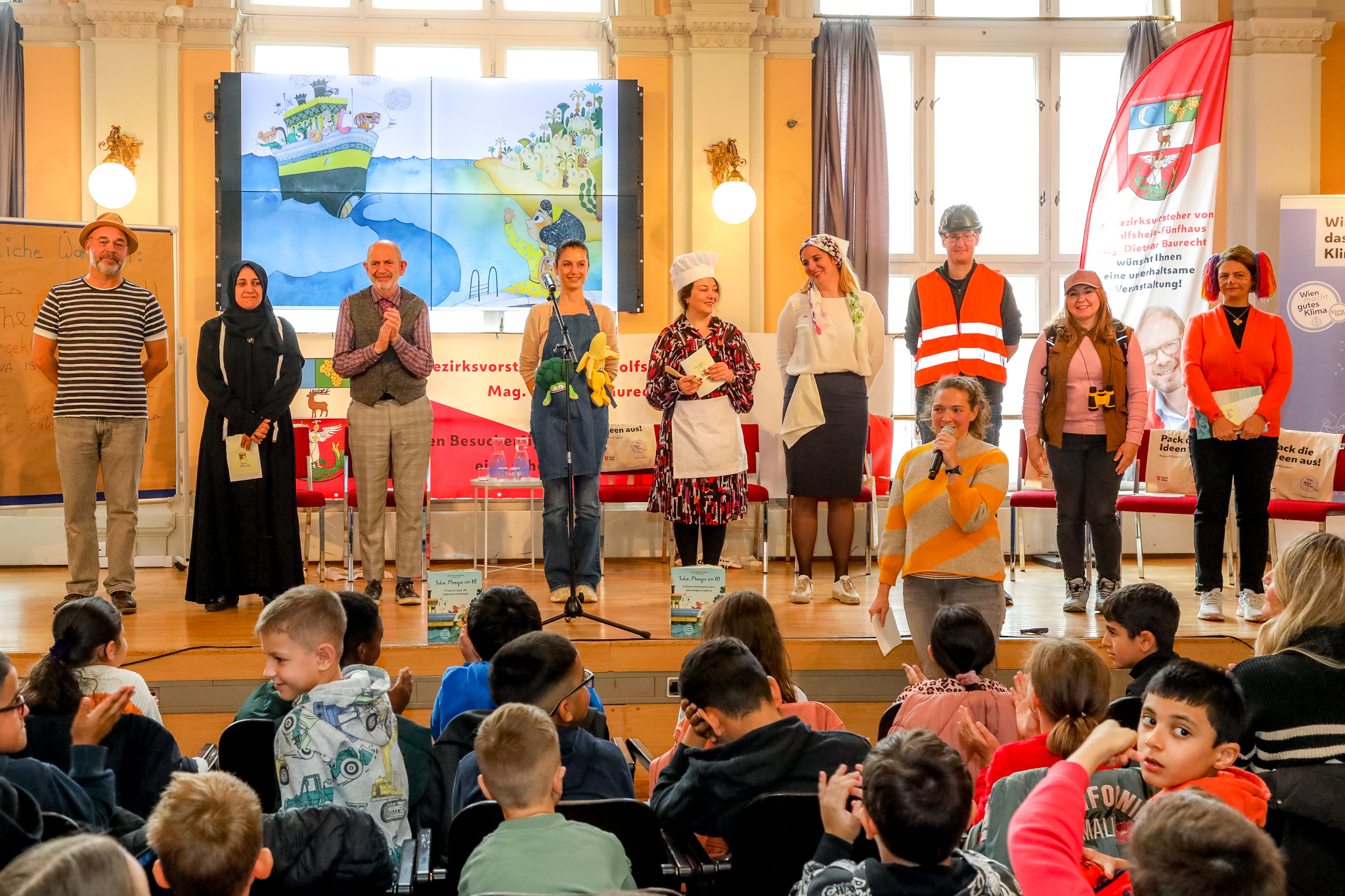 Mehrsprachige Lesepat*innen der Stadt Wien liehen den Figuren des Kinderbuchs „Jeden Morgen um 10“ von Christine Nöstlinger bei einer Lesung im Festsaal des Bezirksamts im 15. Wiener Gemeindebezirk am 1. Oktober 2024 ihre Stimmen.