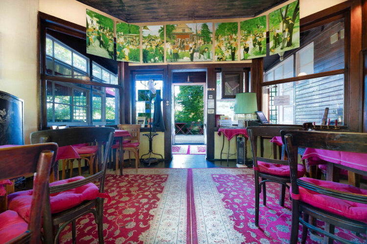 Gasthaus im Grünen mit großem Outdoor-Bereich und namensgebendem Blick auf einen kleinen See.