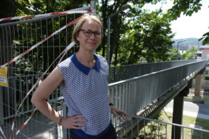 (C) BV 14: Bezirksvorsteherin Michael Schüchner freut sich über den Neubau des Loudonstegs