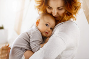 Beautiful young mother tenderly hugs her little cute child. Mom looking at her kid and smiling while baby looks aside and snuggling to mom chest. Happy family moments.