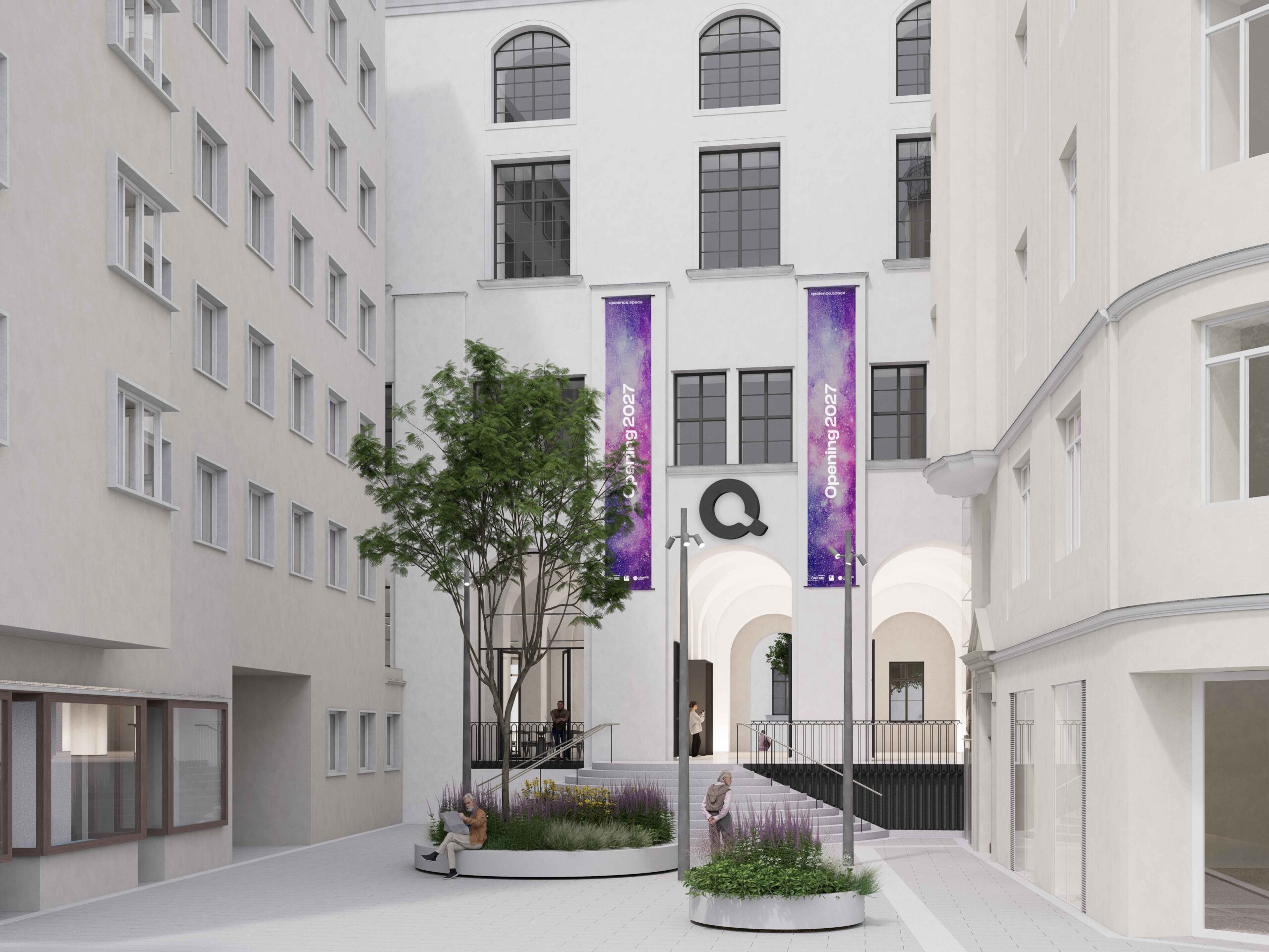 Der Vorplatz an der Wollzeile wird begrünt und mit Sitzgelegenheiten ausgestattet. Bäume, Wasserelemente und offene Arkaden sollen die historische Struktur mit einer zeitgemäßen, einladenden Atmosphäre verbinden. Damit entsteht ein kleiner, aber lebendiger Freiraum, der den öffentlichen Raum sichtbar aufwertet.
