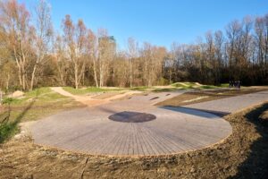 Eine runde Holzplattform bildet den Startpunkt für beide Strecken © Stadt Wien/Markus Wache