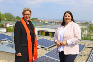 Wiener Wohnen-Direktorin Karin Ramser und Vizebürgermeisterin & Wohnbaustadträtin Kathrin Gaál bei einem Besuch einer Gemeinschafts-PV-Anlage auf dem Dach eines Gemeindebaus in Ottakring.