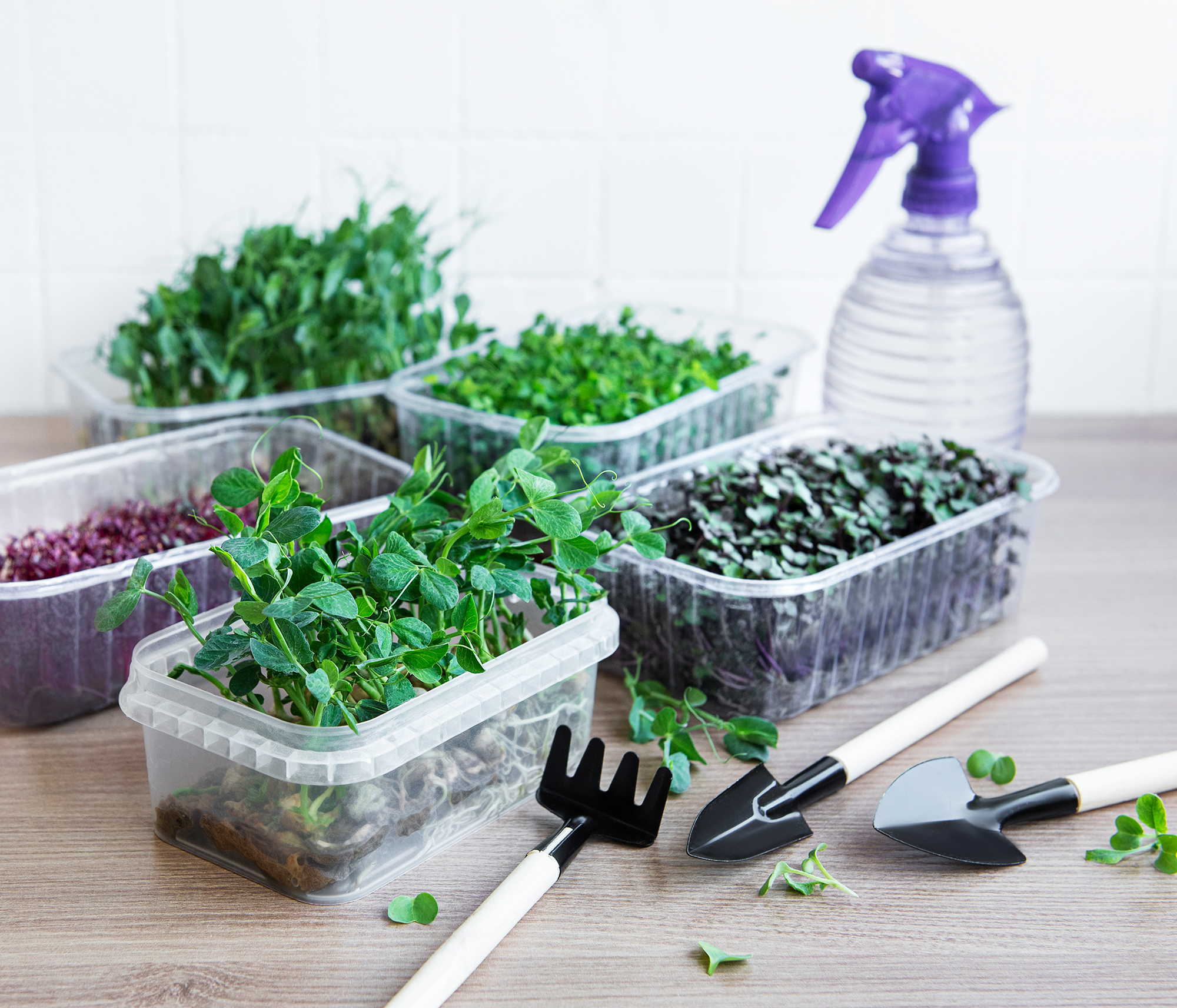 Assortment of micro greens on wooden table