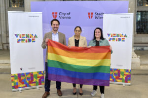 Vzbgm. Christoph Wiederkehr mit Pride Vienna Organisatorin Katharina Kacerovsky-Strobl und Nicole Berger-Krotsch, LGBTQIA+ Sprecherin des SPÖ-Rathausklubs. ©Stadt Wien/Markus Wache