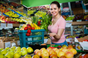 Portrait of young satisfied female purchaser holding shopping basket with fruits and vegetables