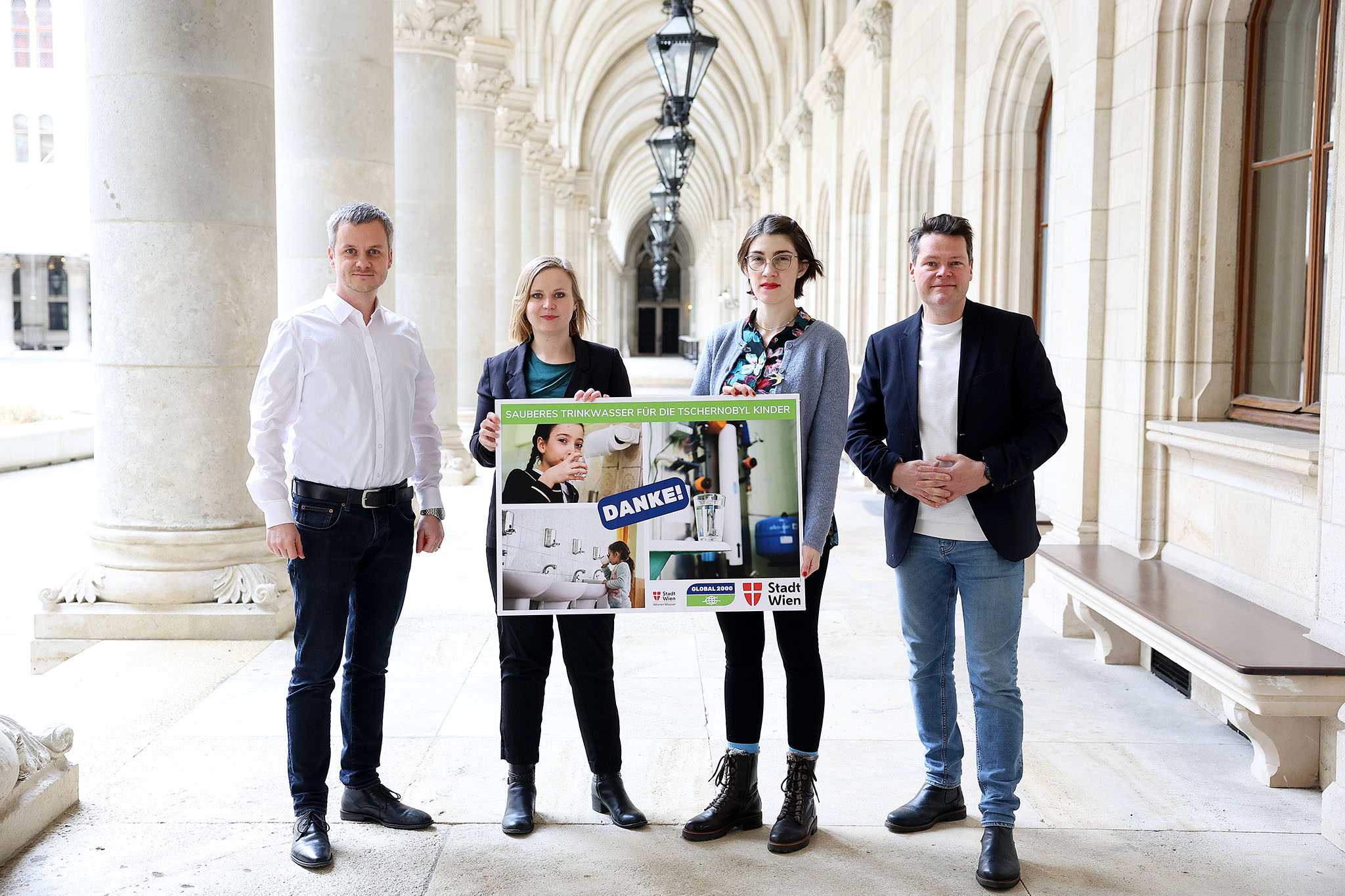 Wiener Wasser-Abteilungsleiter Paul Hellmaier, Global 2000-Geschäftsführerin Agnes Zauner, Global-Projektleiterin Lidiia Akryshora und Klimastadtrat Jürgen Czernohorszky.