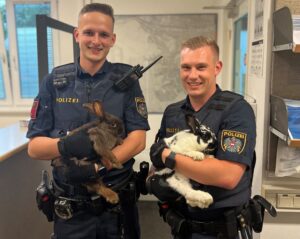 Die Polizeibeamten mit den entlaufenen Hasen (Bild: Polizei).